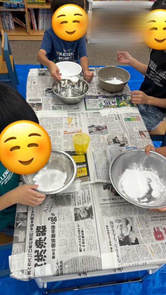 片栗粉と水を使って“ダイラタンシー”づくりを行いました。ダイラタンシーとは、強く押すと固くなり、ゆっくり触るととろ〜っと柔らかくなる不思議な物質です。