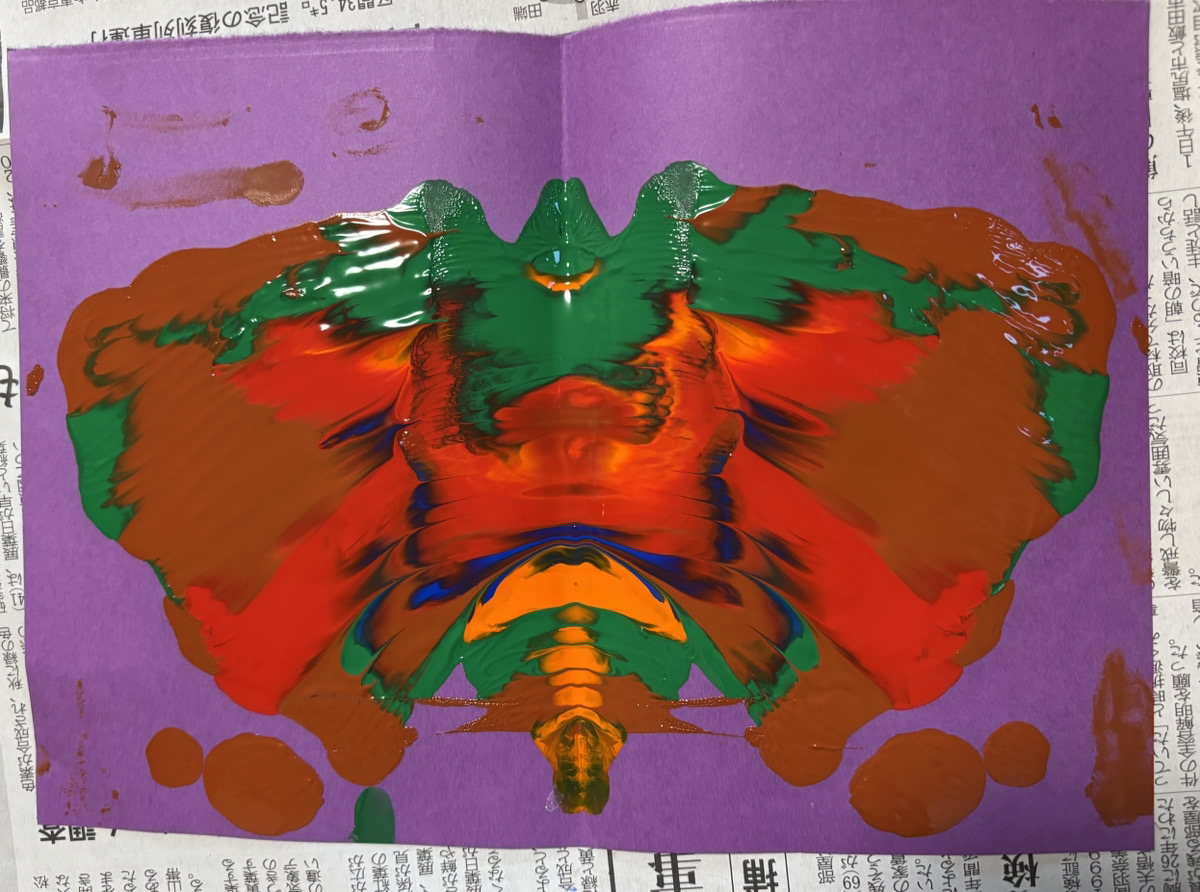 高学年以上のお友だちが絵の具を使ったミニコーナーを行っていて、その様子を見ていた低学年のお友だち。絵の具はまだ使ったことがなかったので、今回筆などを使わずに楽しめる活動を考えました。デカルコマニーという技法を使った活動です。画用紙に好きなように絵の具を垂らしていきます。今回は5色までと色を決めました。垂らし終わったら、画用紙を半分におり画用紙全体をこすっていき、絵の具を引き伸ばしていきます。最後にゆっくりと画用紙を開いていき見てみると・・・あれ!?左右対象になった絵が出てきました!!絵の具を垂らしたときの模様と違った絵になり、子どもたちはびっくり!!出来上がった絵を見て「何に見える?」と聞いてみると「人の横顔!」「かぼちゃパイ!」など色々な意見が出てきました。