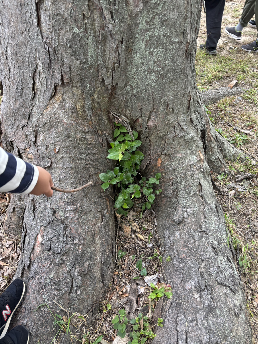 神社に到着してから境内を散策して、かけっこをしたり、銀杏の実を見つけ踏まないように歩いたり・・・と散策を楽しみました。その時に「先生見て~!」と声をかけてくれたお友だち。何かな?と見に行くと、「ほら!これトトロの穴じゃない!?」と教えてくれました(^^)大人では見過ごしてしまうような場所です。私も気づかずに通り過ぎていましたし、その発想も浮かびませんでした。子どもたちの目線ならではの場所でもあり、心を癒してくれるような可愛らしい発言♪ほっこりした気持ちになりました。