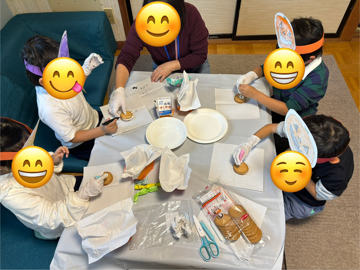 この日はハロウィンの前の日で、一足早くみんなでハロウィンパーティーをしました!おばけや猫、ジャック・オ・ランタンのお面を作ってマシュマロサンドを手作りました。手を洗って手袋を付けて・・・いざクッキング!!チョコペンで書く時の力の入れ具合に少し苦戦しながらも楽しそうに書いていましたよ♪マシュマロをレンジで少し温める時の様子をみんなで見ていましたが、「わぁ!!膨らんでる!!」と新しい発見をしてその様子をみんなで夢中になって見ていました。その姿がとても可愛かったです。出来上がって、パーティー開始♪いつもとは違う手作りのおやつにみんな喜んでいました。もっとないのー!?と言っていた子もいましたよ。特別感を味わいながら過ごすことができて、良かったです!!