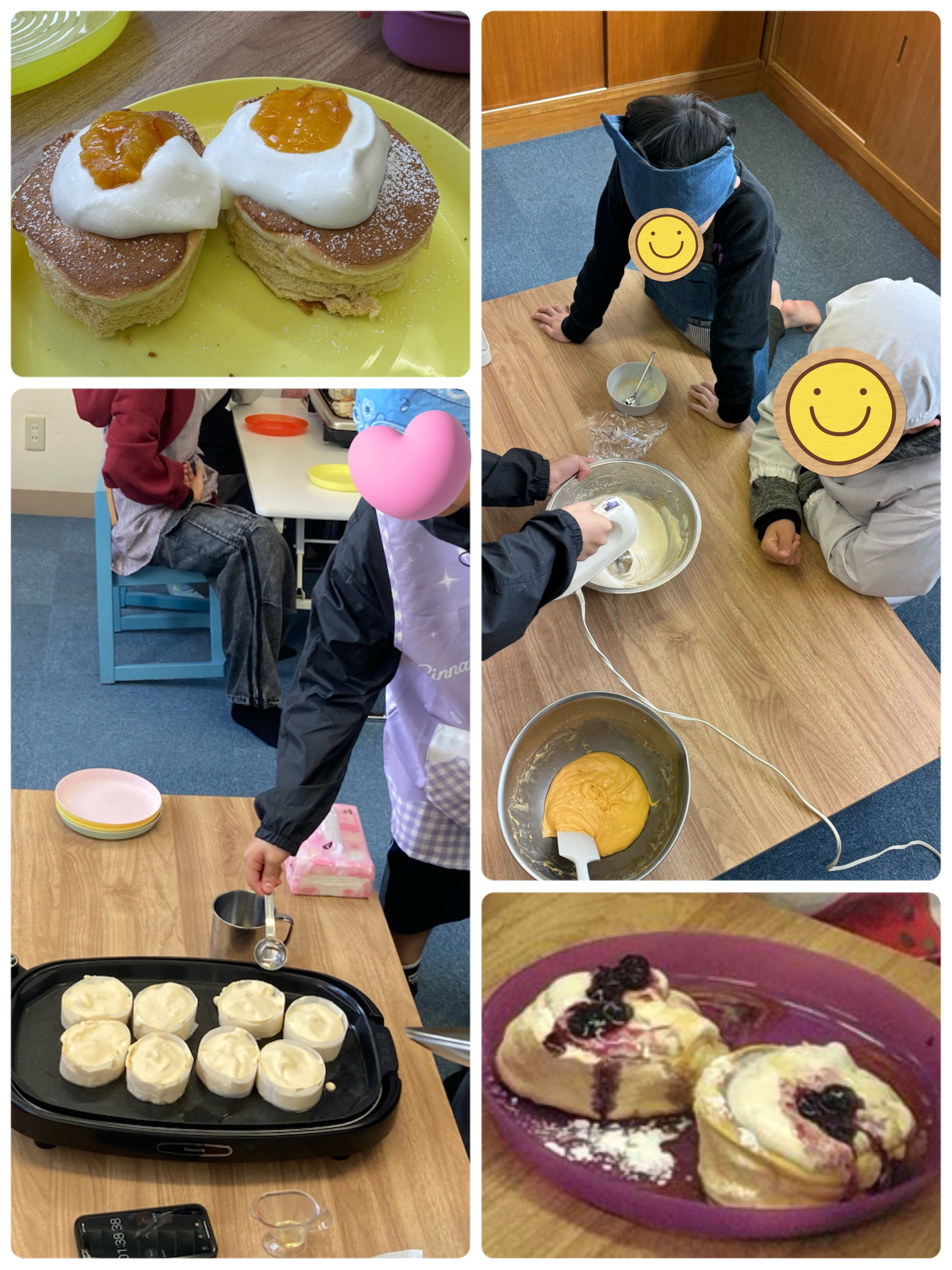 子ども達が想像以上によく話を聞き、指示通り丁寧に作ってくれたおかげで(焼きすぎて少し固くなったー💦というグループもありましたが)、ふわふわのパンケーキが出来上がりました🎵