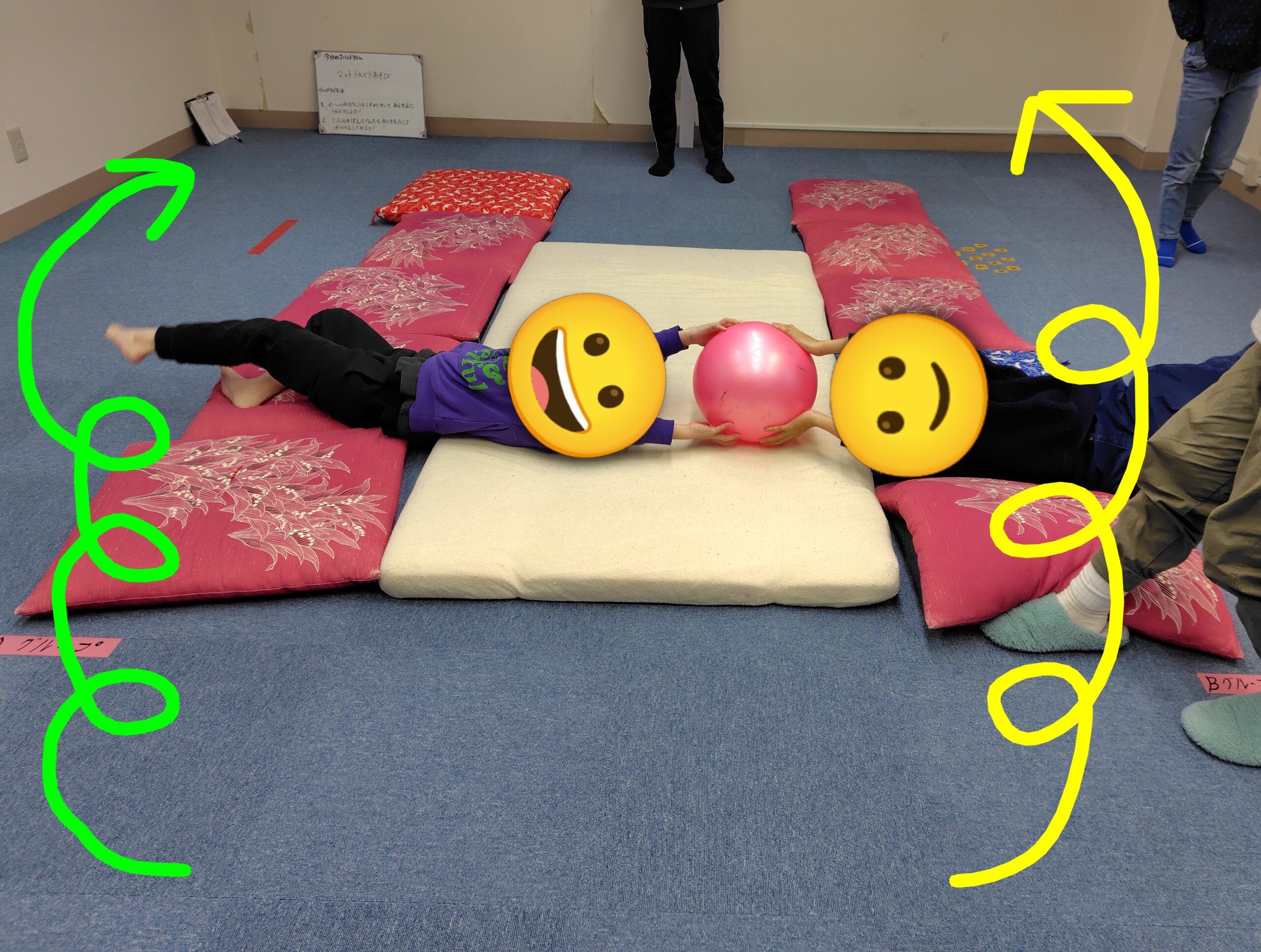 マット運動遊びは、自分の体が今どんな状態か(ボディーイメージ)を知ったり、バランス感覚や力加減を高めるのにとても良いとされています。